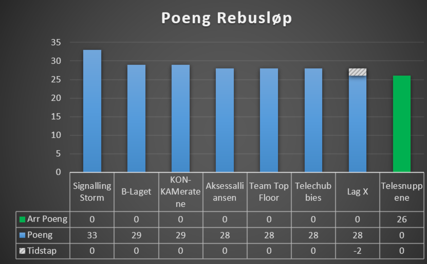 Ei viss spenning var det likevel undervegs da Signalling Storm stilte med nesten fullt lag og sterk innsats i Rebusløpet. Og i Tipp Vekten konkurransen der oppgava var å tippe vekta på eit stort glass fylt med godteri hadde alle like sjansar til å vinne. I denne konkurransen vart det til slutt Aksessalliansen som gjekk til topps. Men også B-laget gjorde det sterkt og sikra dermed samanlagtseieren med god margin.