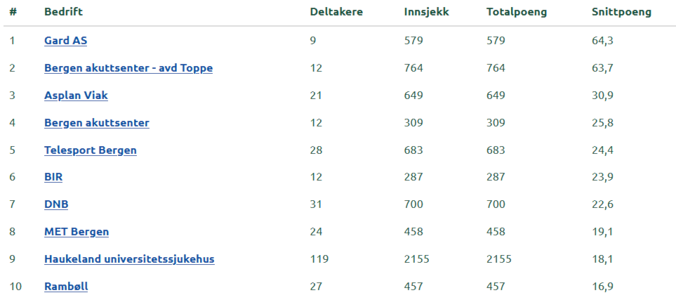 I bedriftskonkurransen ligg vi på 5-plass og må stå på også siste veka for å holde BIR og DNB bak oss